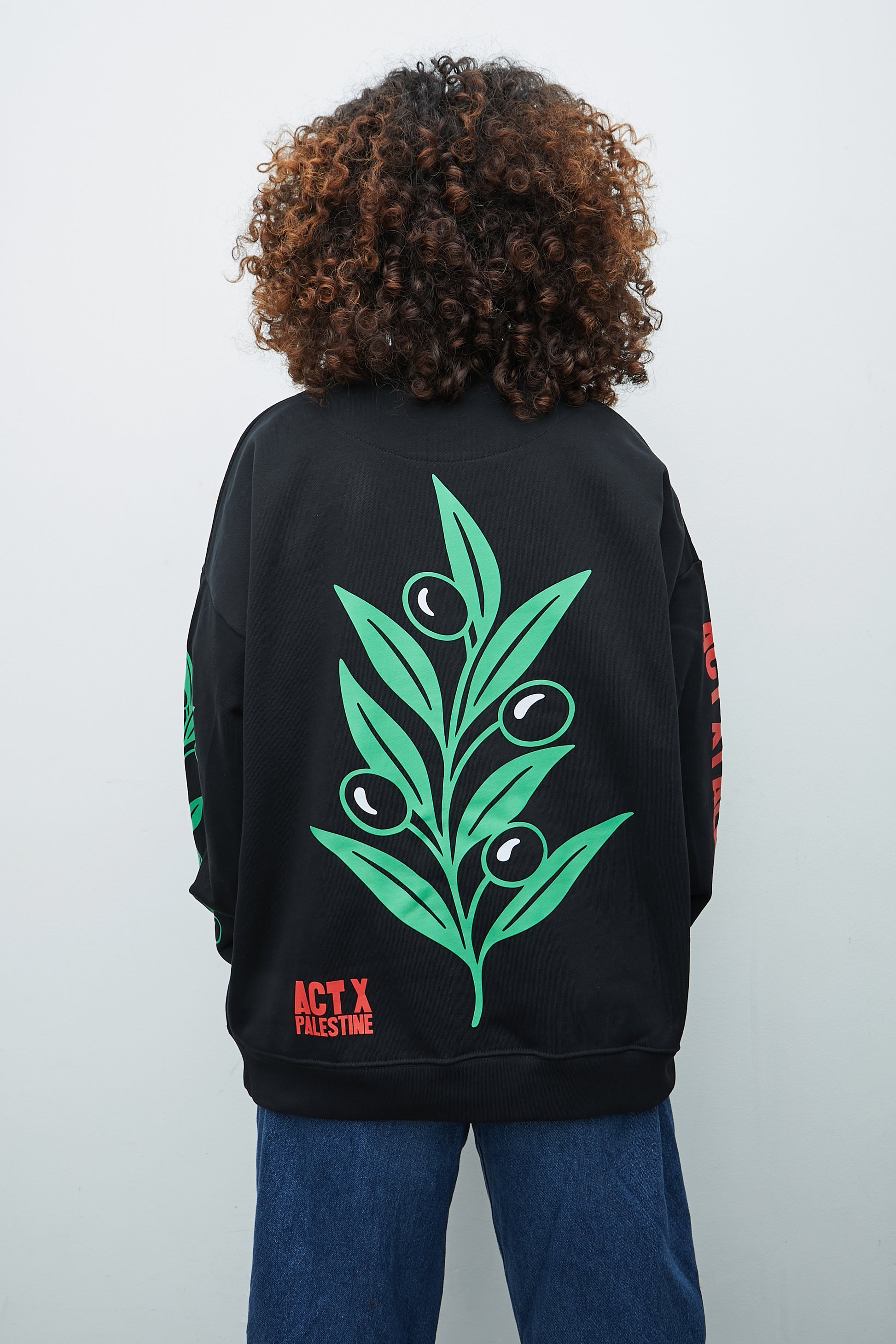 Sudadera unisex negra con la palabra Palestina en árabe y el suimanga palestino, el pájaro nacional que simboliza la libertad y la resiliencia de un pueblo que persevera. En la manga derecha, el detalle ACT X PALESTINE en rojo, mientras que la manga izquierda incorpora un patrón de olivos verdes, símbolo de arraigo y de la resistencia del pueblo palestino.